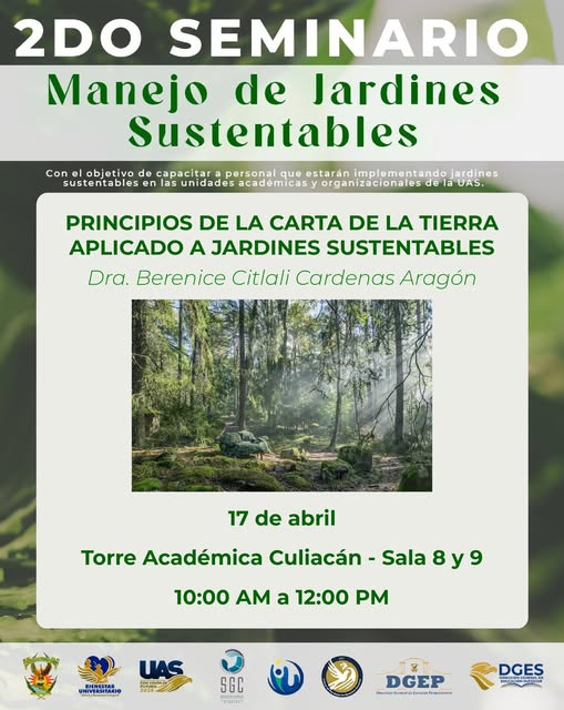 La Universidad Autónoma de Sinaloa, a través de la Unidad de Bienestar Universitario, invita a la comunidad universitaria a participar en el 2do Seminario: Manejo de Jardines Sustentables, una iniciativa orientada a fortalecer las capacidades del personal que implementa y gestiona espacios verdes sustentables en las unidades académicas y organizacionales de la UAS.